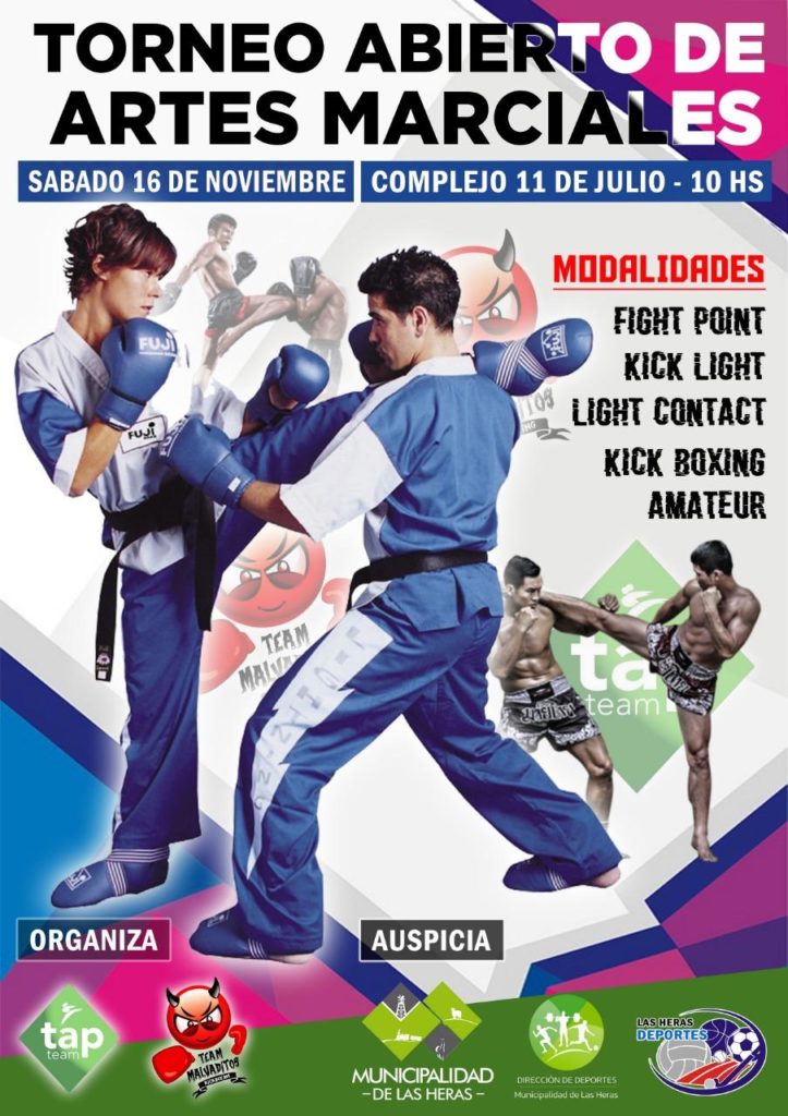 Cabe recordar que el Torneo Abierto de Artes Marciales contemplaba la presentación de varias escuelas de artes marciales de la zona, en las modalidades Fight Point, Kick Light, Light Contact y Kick Boxing amateur , bajo la organización de las escuelas Tap Team y el Team Malvaditos, con el auspicio de la Direcciòn Municipal de Deportes .