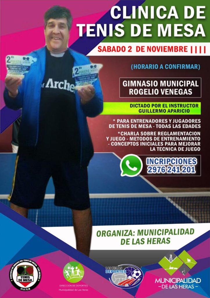 Para el pròximo sàbado 02 de Noviembre en las instalaciones del Gimnasio Municipal Rogelio Venegas, se programò la realizaciòn de una CLINICA DE TENIS DE MESA dictada por el Instructor caletense GUILLERMO APARICIO, quien posee una vasta experiencia como jugador y como instructor de Nivel 1 en esta actividad deportiva .