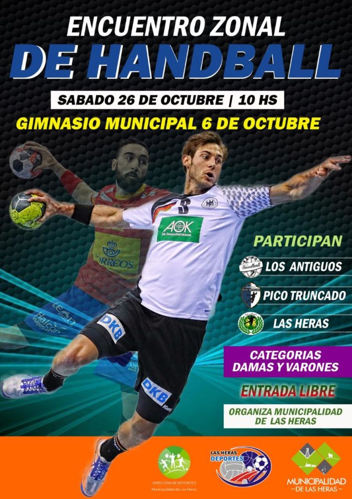 La Escuela Municipal de Handball dependiente de la Dirección Municipal de Deportes de la Municipalidad de Las Heras organiza para este sábado 26 de Octubre a partir de las 10 horas encuentros amistosos de balonmano en el cual participaràn equipos invitados de Los Antiguos, Pico Truncado y Las Heras en las categorìas Mayores Masculino y Femenino .