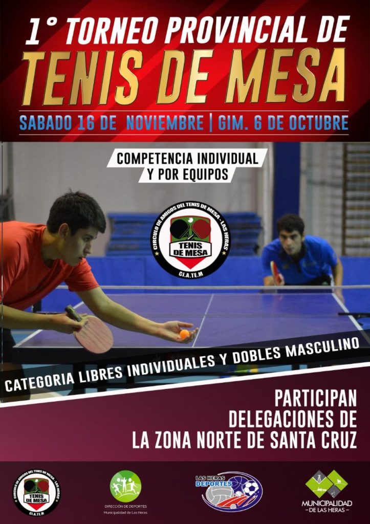 La Municipalidad de Las Heras en conjunto con las áreas deportivas Direcciòn Municipal de Deportes y organismo “Las Heras Deportes” informa la realización del 1º TORNEO PROVINCIAL DE TENIS DE MESA para el próximo sábado 16 de Noviembre en las instalaciones del Gimnasio Municipal “6 de Octubre” del Barrio Güemes.
