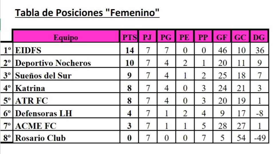 Hasta el momento y disputadas 5 fechas en la categorìa femenina las posiciones son encabezadas por la Escuela Municipal de Las Heras que dirige el Profesor Juan Sepùlveda con 13 puntos en 5 partidos jugados. Manzur Voley de Pico Truncado tiene el mismo puntaje pero con un partido màs.