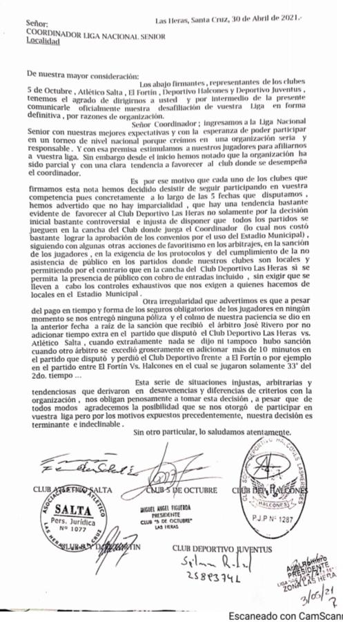 Tal como adelantamos el pasado viernes, efectivamente se presentò la nota firmada por los delegados de los clubes 5 de Octubre, Salta, El Fortìn, Juventus y Halcones mediante la cual se comunicò al coordinador de Liga Nacional Senior Subsede Las Heras Sr. Ariel Romero la decisión de desafiliarse y no continuar la disputa del torneo que se aprestaba a programar la segunda rueda para el presente mes de Mayo .