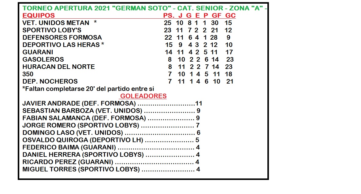 En Senior en la Zona “A” manda en las posiciones Veteranos Unidos de Metan, luego de su triunfo del fin de semana ante 350 por 5 a 3, lo que le permite mantenerse en el liderazgo del certamen con 25 Puntos, y un partido pendiente de culminarse con el Deportivo Las Heras.