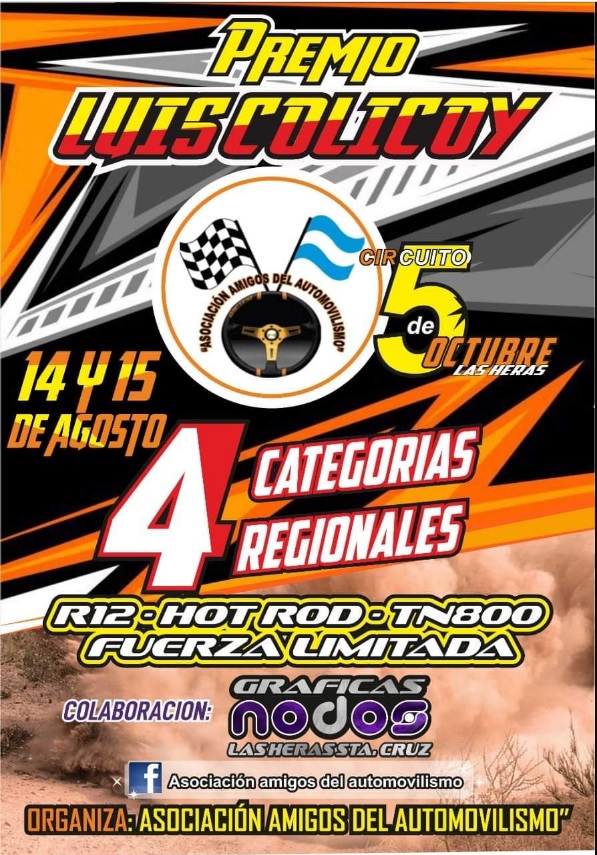 *En el Circuito 5 de Octubre y bajo la organización de la Asociación Amigos del Automovilismo de Las Heras , se producirá el regreso de las cuatro categorías regionales luego del parate obligado por la pandemia . Habrà una muy buena participación de pilotos lasherenses, principalmente en las categorìas R 12 y Fuerza Limitada Regional . EL SABADO SE DISPUTA EL GRAN PREMIO “LUIS COLICOY” EN HOMENAJE AL EMPLEADO VIAL DESAPARECIDO FISICAMENTE HACE UNOS MESES. EL DOMINGO SE CORRE EL GRAN PREMIO “MUNICIPALIDAD DE LAS HERAS” *