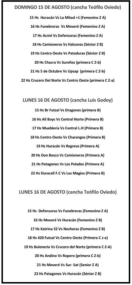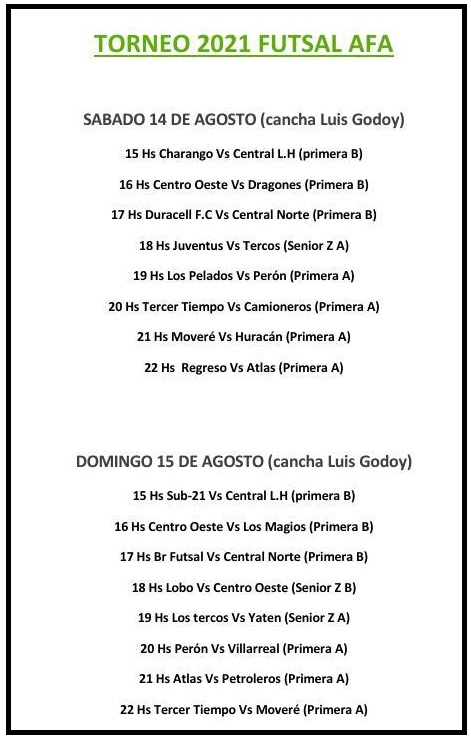 *En las canchas Luis Godoy y Teòfilo Oviedo del Complejo Municipal 11 de Julio se continuarà la disputa de los torneos oficiales de las categorías locales del Fut Sal modalidad AFA. La actividad se programò para los días Sàbado 14, domingo 15 y Lunes 16 de Agosto (feriado) *