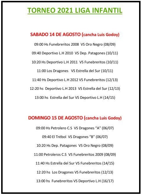 *En las instalaciones del Complejo Municipal 11 de Julio tambièn este fin de semana (sàbado y domingo) se inicia la disputa del primer torneo oficial de la temporada luego del parate por la Pandemia . Habrà actividad en la cancha Luis Godoy durante los dìas sàbado y domingo segùn el siguiente programa de partidos :
