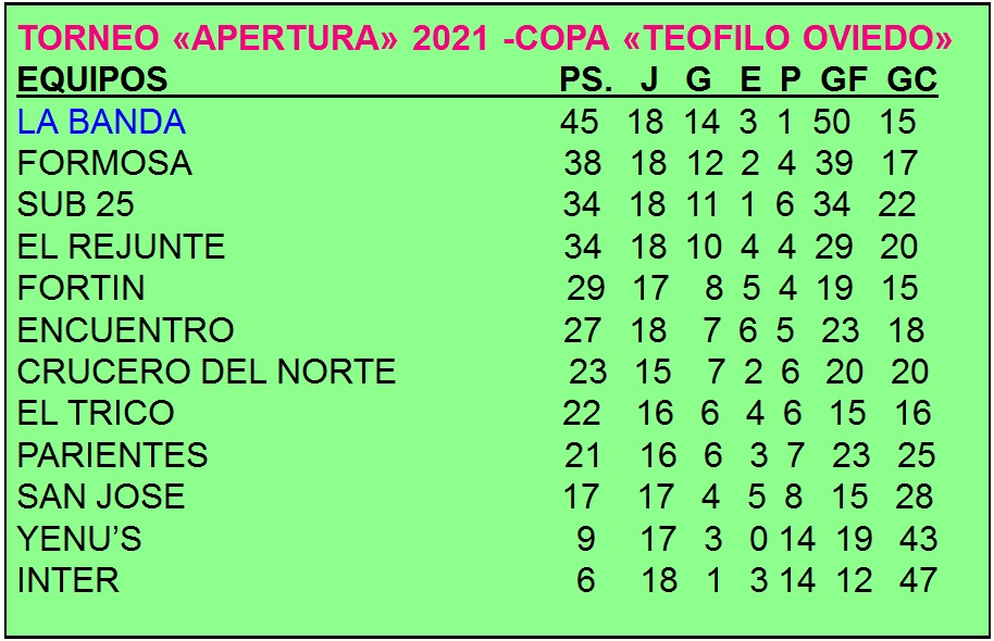 Luego de estos guarismos las posiciones siguen encabezadas solitariamente por LA BANDA con 45 puntos y quedaron de la siguiente manera :
