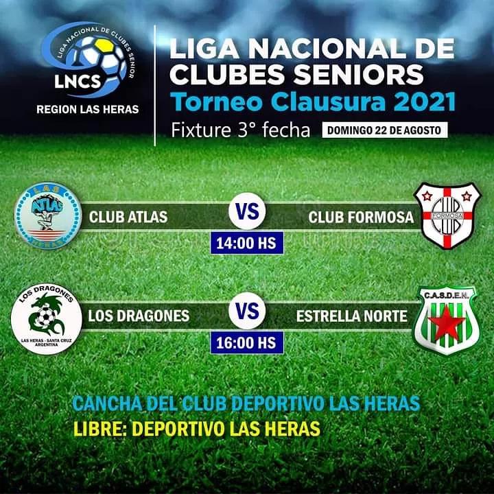 *La 3era fecha del Torneo Clausura 2021 de la Liga Nacional Senior se juega este domingo 22 en la cancha del Club Deportivo Las Heras. Jugadas las dos primeras fechas Atlas es el único líder, seguido por el Club Deportivo LH y Los Dragones*