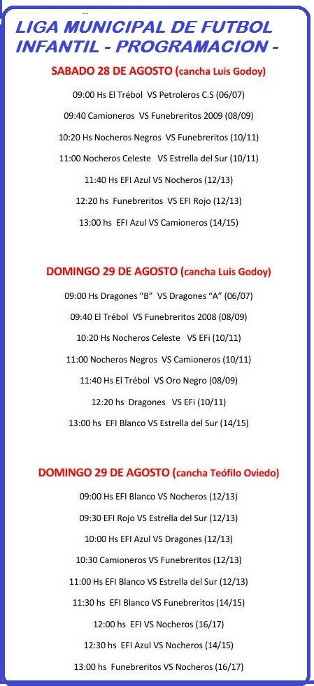 *Durante sàbado y domingo en las instalaciones del Complejo Municipal 11 de Julio continuarà el desarrollo del Torneo Oficial de la Liga Municipal de Futbol Infantil que organiza la Coordinaciòn de esta actividad dependiente de la Subsecretarìa Municipal de Deportes. El programa de partidos es el siguiente :