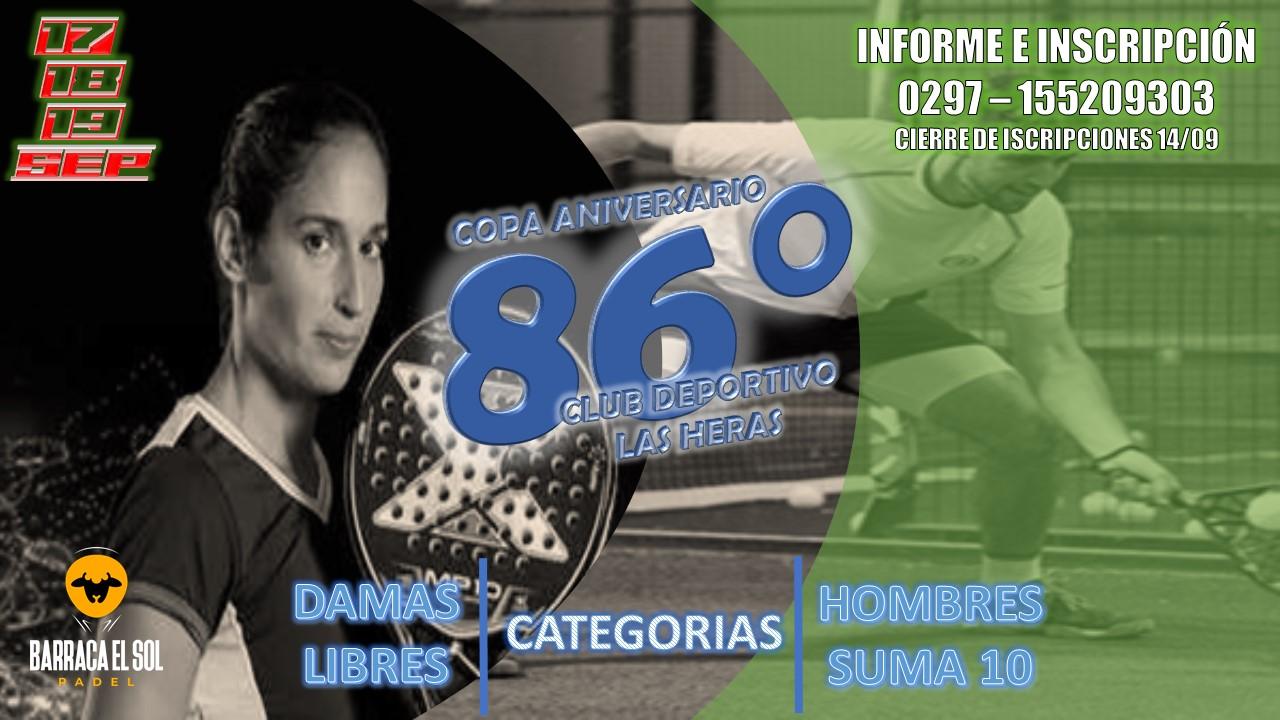 Hasta el martes 14 de Septiembre siguen abiertas las inscripciones para participar en el Torneo de Padel “86º Aniversario Club Deportivo Las Heras” que comprenderà las categorías Damas Libres y Varones Suma 10 .
