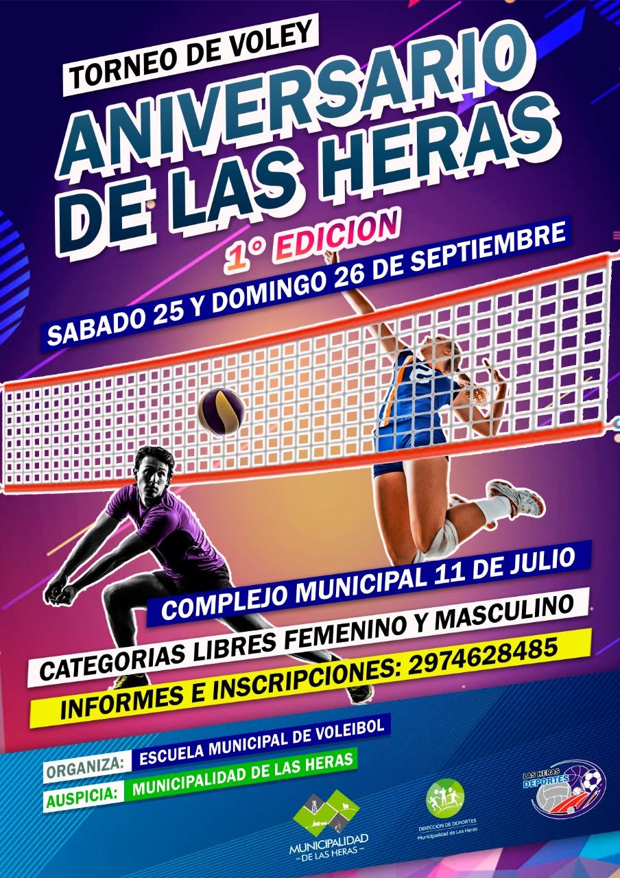 Durante el sábado 25 y domingo 26 de Septiembre en las instalaciones del Complejo Municipal 11 de Julio y bajo la organización de la  Escuela Municipal de Voleibol que dirige el profesor Juan Sepùlveda, se juega  la 1º edición  del Torneo “ANIVERSARIO DE LAS HERAS”, en adhesión a los festejos del  aniversario de nuestra localidad que se celebra cada 6 de  Octubre.