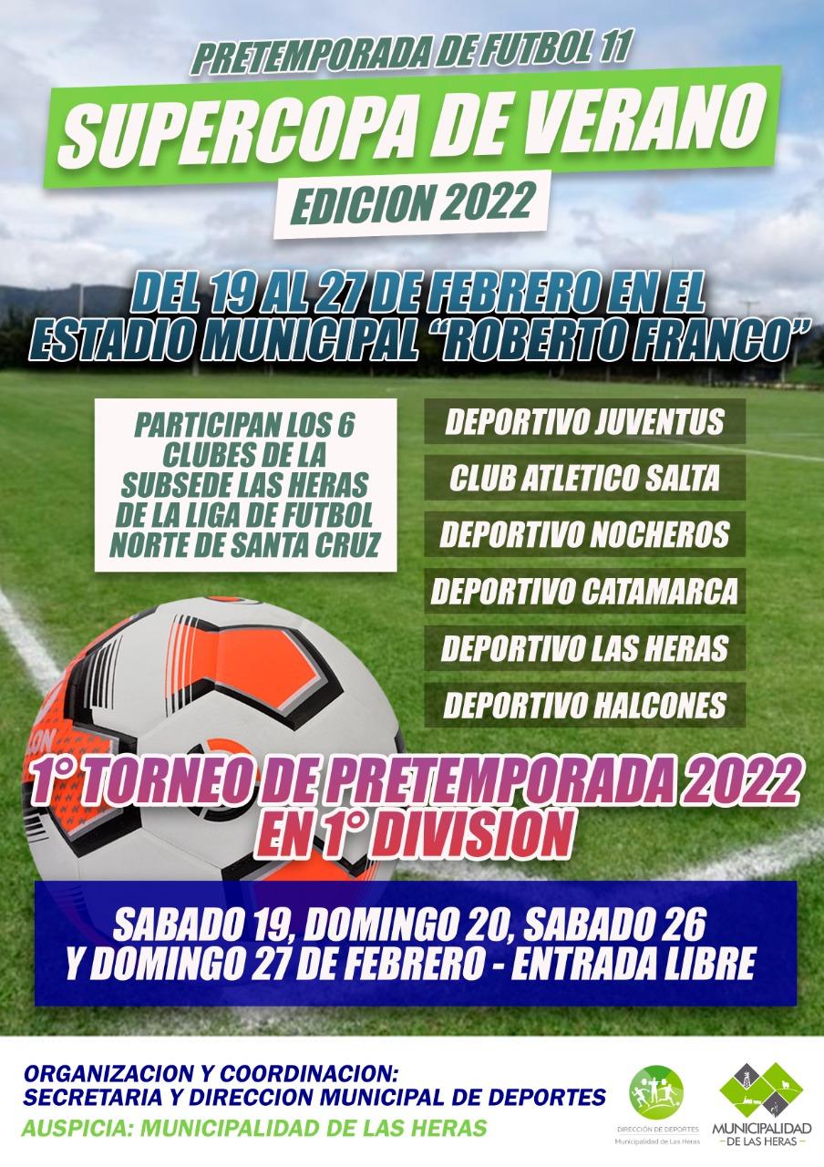 *La SUPERCOPA DE VERANO 2022 es un Torneo reducido de fútbol amistoso de pretemporada que contarà con la participación de los seis clubes locales que integran la Subsede Las Heras de la Liga de Fútbol Norte de Santa Cruz. Participan Deportivo Nocheros , Deportivo Las Heras , Deportivo Juventus , Deportivo Catamarca , Deportivo Halcones y Atlético Salta , únicamente en Primera División *