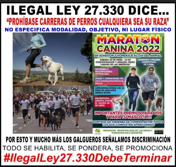 Bajo el título «la discriminación es flagrante y constante …, hasta cuándo ? …» un grupo de personas que se sienten perjudicadas por la sanción de la ley 27.330 que prohíbe en el ámbito del territorio nacional las carreras de galgos salió a cuestionar duramente la realización del evento que se llevará a cabo en nuestra ciudad por primera vez el próximo sábado 30 de abril .