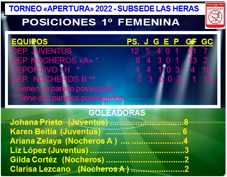 En 1era. División Femenina el DEPORTIVO JUVENTUS pasó a ocupar la posición de líder al ganarle a Nocheros “A” en su estadio el último sábado, asegurándose buena parte de la clasificación en el primer puesto.