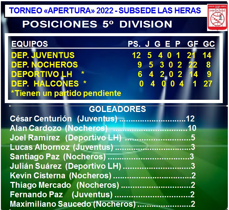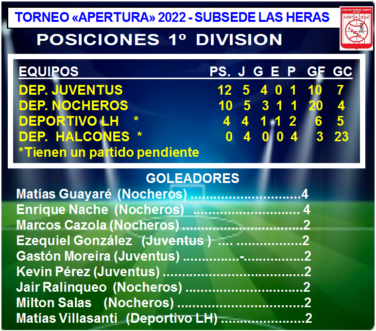 El domingo se miden Deportivo Las Heras y Halcones para completar la disputa de la 5ta. fecha del Torneo “Apertura” 2022 que organiza la Subsede Las Heras de la Liga de Fútbol Norte de Santa Cruz .