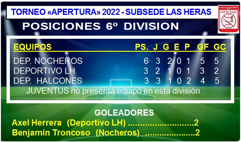 En 6ta. División Nocheros es el líder con 6 puntos pero con un partido más que el Deportivo Las Heras y que Halcones, que se enfrentan este domingo . Al estar ambos con 3 unidades (el Depo y el Halconero) , el que gane igualará a Nocheros y quedarán los tres con 6 puntos , definiéndose el primer puesto en la última fecha cuando se enfrenten Nocheros y el Deportivo Las Heras.