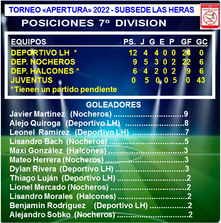 En 7ma. el líder absoluto y con un partido menos es el Club Deportivo Las Heras que suma 12 puntos y puntaje ideal . Con un empate ante Halcones en el partido postergado que se juega el domingo, el Depo se asegura el primer puesto y la liguilla la disputarían Nocheros y Halcones.