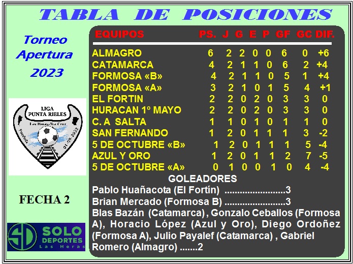 La 2da. jornada del torneo que organiza la Liga Punta Rieles registró la contundente goleada por 4 a 0 de Almagro ante Formosa “A”, en el choque de dos equipos que habían ganado en la primera fecha . Con esta contundente victoria , el conjunto tricolor se ubica solitariamente al frente de las posiciones con puntaje ideal , ya que los otros equipos que habían ganado en la fecha inicial empataron.