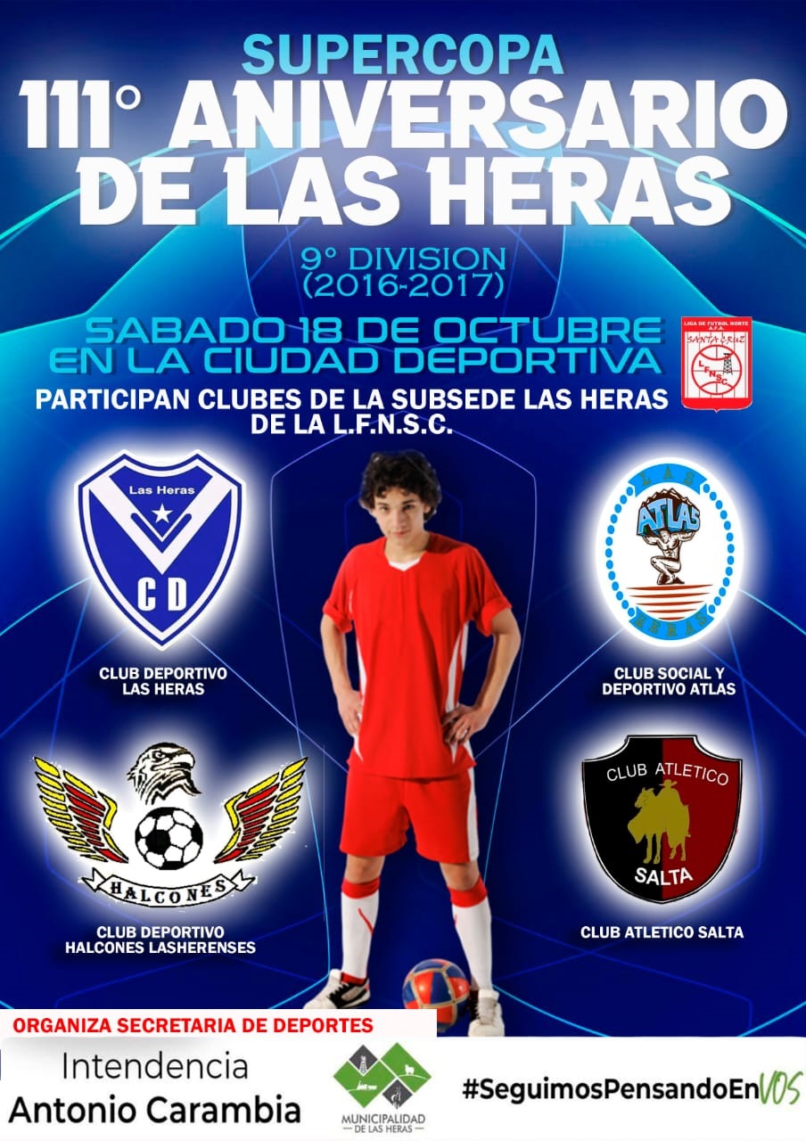 *Esta tarde en la Ciudad Deportiva Municipal comienza a jugarse la Supercopa “111º Aniversario de Las Heras” en 9º División . Participan los clubes Deportivo Las Heras, Atlético Salta, Halcones Lasherenses y Deportivo Atlas. El evento es organizado por la Secretaría Municipal de Deportes en forma conjunta con la Subsede Las Heras de la Liga de Fútbol Norte de Santa Cruz en adhesión a los festejos del aniversario de nuestra ciudad *