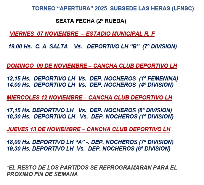 *Durante el fin de semana se completó la disputa de la 5ta fecha que puso fin a la 1era rueda del Torneo “Apertura” 2025 . Deportivo Nocheros, que tuvo fecha libre, culminó como líder en 1era. división masculina y femenina y en 4ta. División. Deportivo Las Heras se aseguró el liderazgo en 6ta. y en 7ma. División y junto con el Deportivo Juventus también es líder en 8va. Durante este fin de semana se juega parcialmente la 1era. fecha de la 2da. rueda *