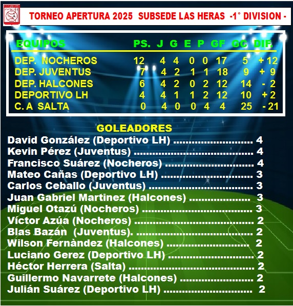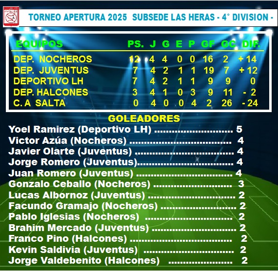 En 4ta. División el líder Nocheros tuvo fecha libre y el Deportivo Juventus, con su abultada goleada por 11 a 0 ante el Club Atlético Salta , se aseguró la posición de escolta , posición que comparte con el Club Deportivo Las Heras que en su cancha le ganó 3 a 2 al Deportivo Halcones con un hat trick de Yoel Ramirez.