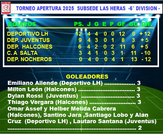En 6ta. División el sábado Juventus goleó 3 a 0 a Salta y el Club Deportivo Las Heras venció por la mínima diferencia (1 a 0) el domingo al Deportivo Halcones, para culminar como ùnico puntero y con puntaje ideal .