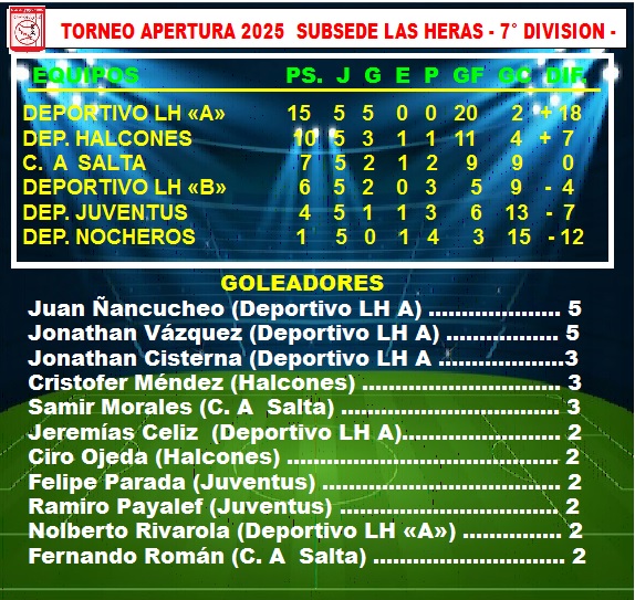 En 7ma. División , Deportivo LH “B” le ganó 4 a 0 a Nocheros el viernes y también ese día pero en el Estadio Municipal, el Club Atlético Salta venció 2 a 1 a Juventus .