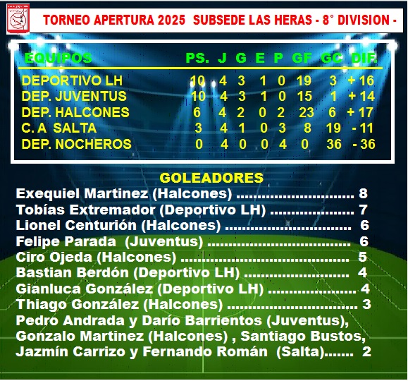 El viernes se inició la jornada en dos canchas en forma simultánea . En 8º División y en el reducto de tierra del Club Deportivo Las Heras, el local y Halcones protagonizaron un partido equilibrado que se definió en favor del Depo por 3 a 2 , lo que le permitió culminar la rueda inicial como líder junto al Deportivo Juventus, que en el Estadio Municipal goleó al Club Atlético Salta por 5 a 0 .