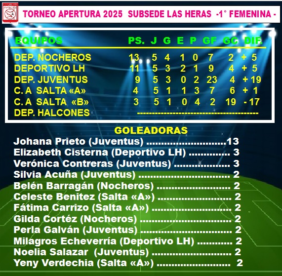 *Durante el fin de semana se completó la disputa de la 5ta fecha que puso fin a la 1era rueda del Torneo “Apertura” 2025 . Deportivo Nocheros, que tuvo fecha libre, culminó como líder en 1era. división masculina y femenina y en 4ta. División. Deportivo Las Heras se aseguró el liderazgo en 6ta. y en 7ma. División y junto con el Deportivo Juventus también es líder en 8va. Durante este fin de semana se juega parcialmente la 1era. fecha de la 2da. rueda *
