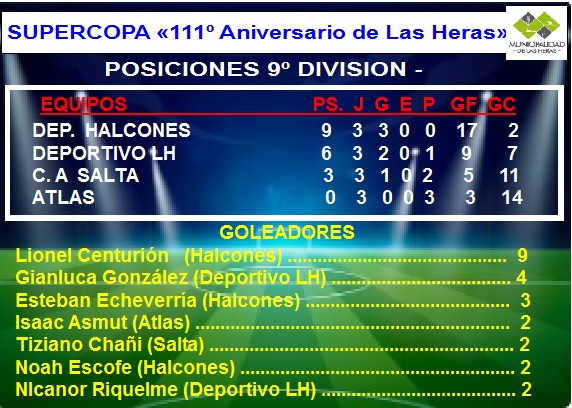 *En la jornada de ayer martes quedaron definidas las posiciones de la fase clasificatoria de la Supercopa “111º Aniversario de Las Heras” que se juega en la Ciudad Deportiva bajo la organización de la Secretaría de Deportes Municipal . Halcones venció 5 a 0 a Atlas y se aseguró el primer lugar . Deportivo Las Heras le ganó 3 a 0 a Salta y culminó en el segundo puesto. La semana que viene se juegan los cruces para definir los finalistas del certamen *