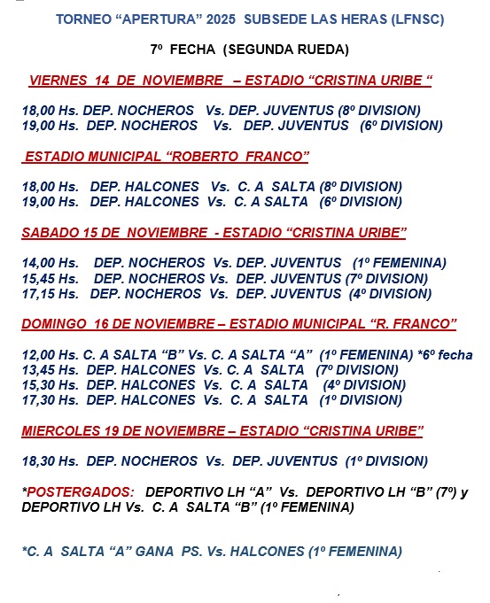 *Cumplida en forma parcial la disputa de la  1era. fecha de la 2da. rueda, este fin de semana se juega íntegramente la  fecha siguiente con los enfrentamientos entre  Nocheros  vs. Juventus y Halcones vs. Salta , cumpliendo jornada libre el Deportivo Las Heras .  En 1era. división este miércoles  Deportivo Nocheros venció 2 a 0 al Club Deportivo Las Heras  y continúa como líder de las posiciones con puntaje ideal . En 1º División Femenina las chicas del Depo le ganaron a las Nocheras por 2 a 1 el pasado domingo  y pasaron a liderar las posiciones *