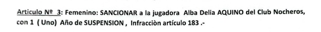 El conjunto visitante  sufrió  la expulsión de dos jugadoras en un partido que se complicó por algunos reclamos y los posteriores fallos arbitrales que derivaron en un  informe lapidario del árbitro Eduardo Herrero y en durísimas  sanciones impuestas por el Tribunal de Disciplina de la LFNSC (1 año de suspensiòn  para la arquera de Nocheros   Delia  Aquino  y 12 fechas para el Director Técnico Mauro Sepúlveda)