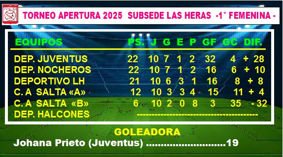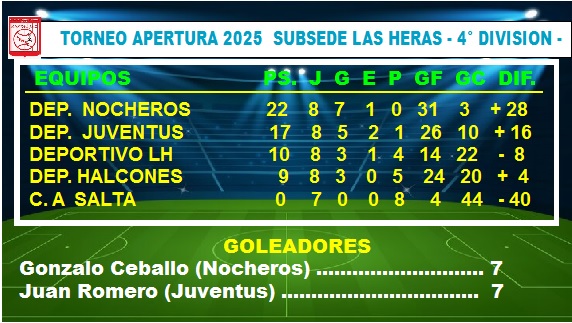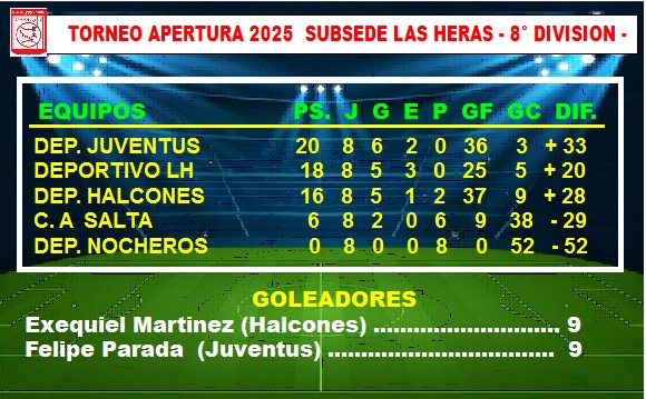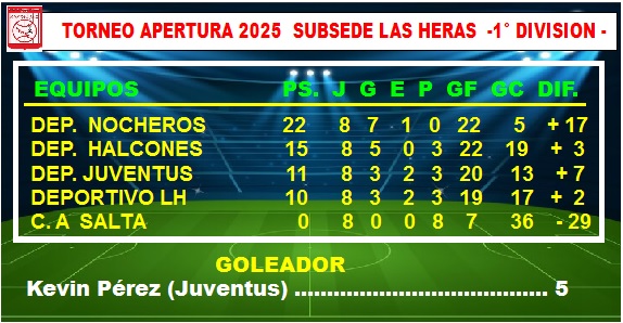 Durante el fin de semana largo se disputó la ùltima fecha de la fase de clasificación del Torneo “Apertura” 2025 de la Subsede Las Heras . Solamente faltan definirse los cruces de los playoff en 6ta. y 7ma. división, ya que entre miércoles y jueves se completaràn los partidos pendientes (Juventus-Salta y Halcones-Deportivo Las Heras en 6ta. y Halcones-Deportivo LH en 7ma.)