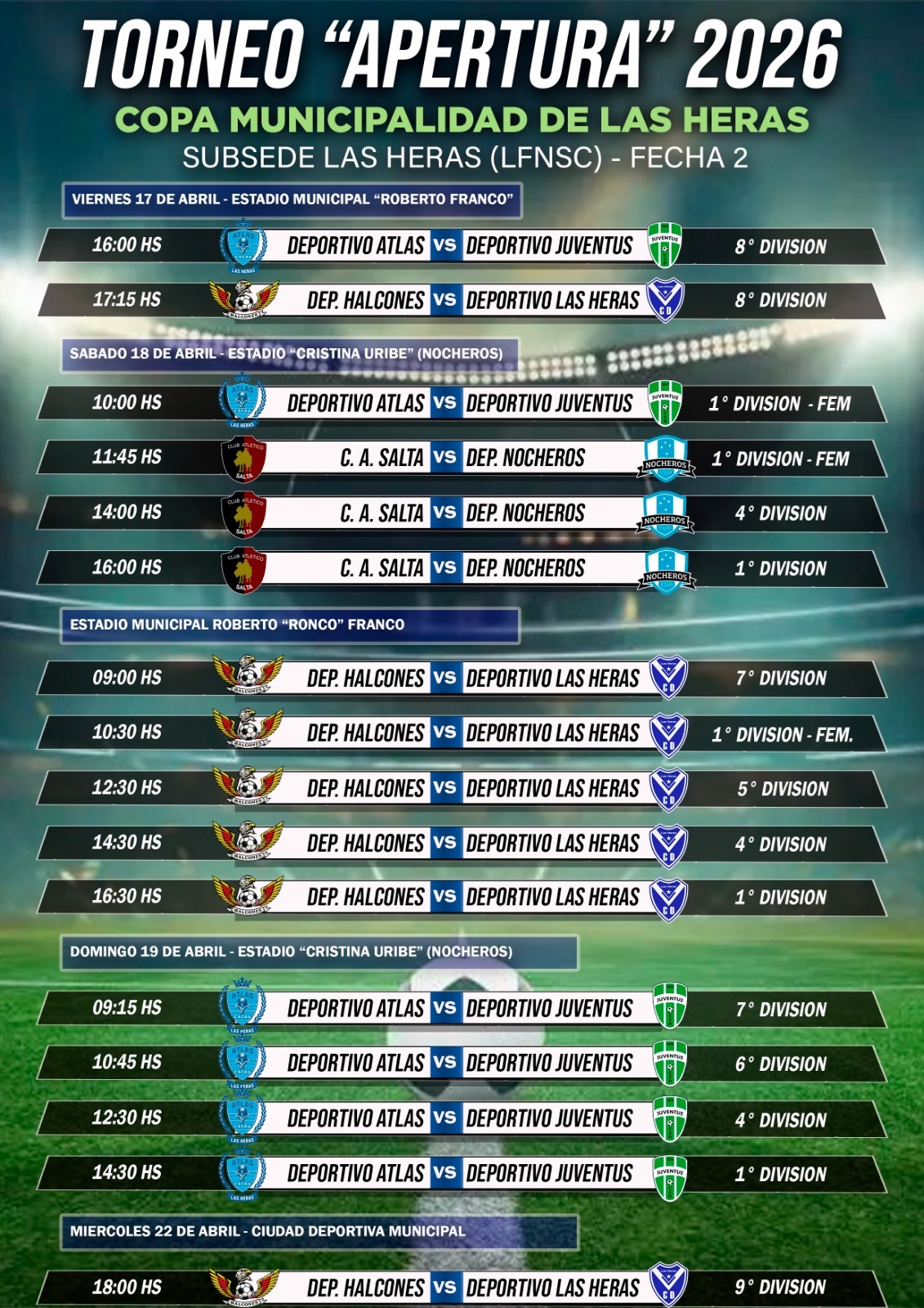 Desde hoy viernes y durante sàbado y domingo se disputarà la 2da fecha del certamen . La programación se inicia con los partidos de 8va. división entre ATLAS-JUVENTUS y HALCONES-DEPORTIVO LAS HERAS a disputarse en el Estadio Municipal “Roberto Franco” .