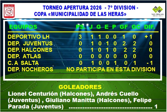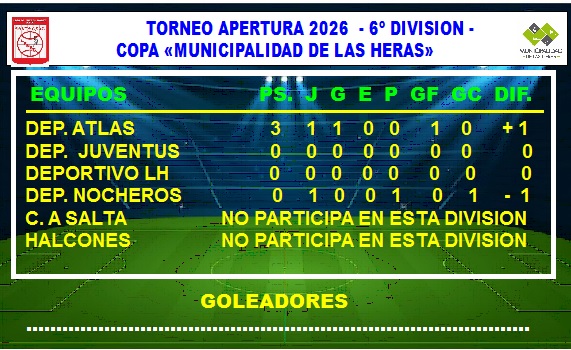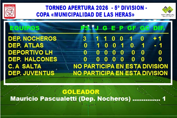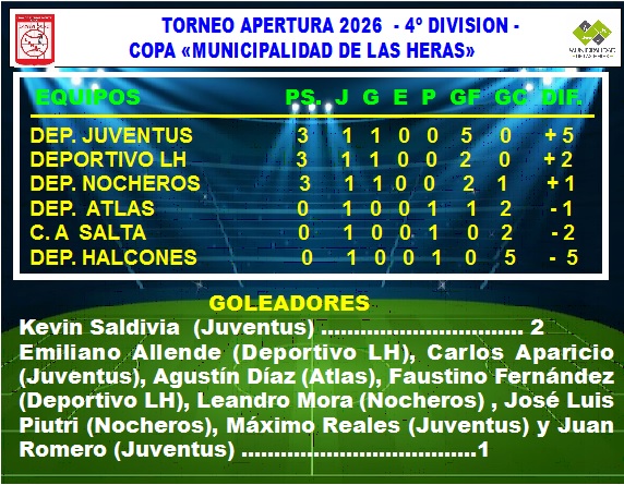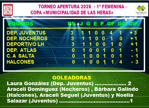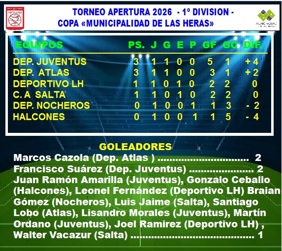 *Durante el fin de semana arrancó la disputa del Torneo “Apertura” 2026 Copa Municipalidad de Las Heras de la Liga de Fútbol Norte de Santa Cruz. En 1era. división Juventus goleó 5 a 1 a Halcones y el debutante Atlas le ganó de visitante al último campeón (Deportivo Nocheros) por 3 a 1 . Igualaron 2 a 2 Deportivo Las Heras y el Club Atlético Salta . Este fin de semana se juega la 2da. fecha *
