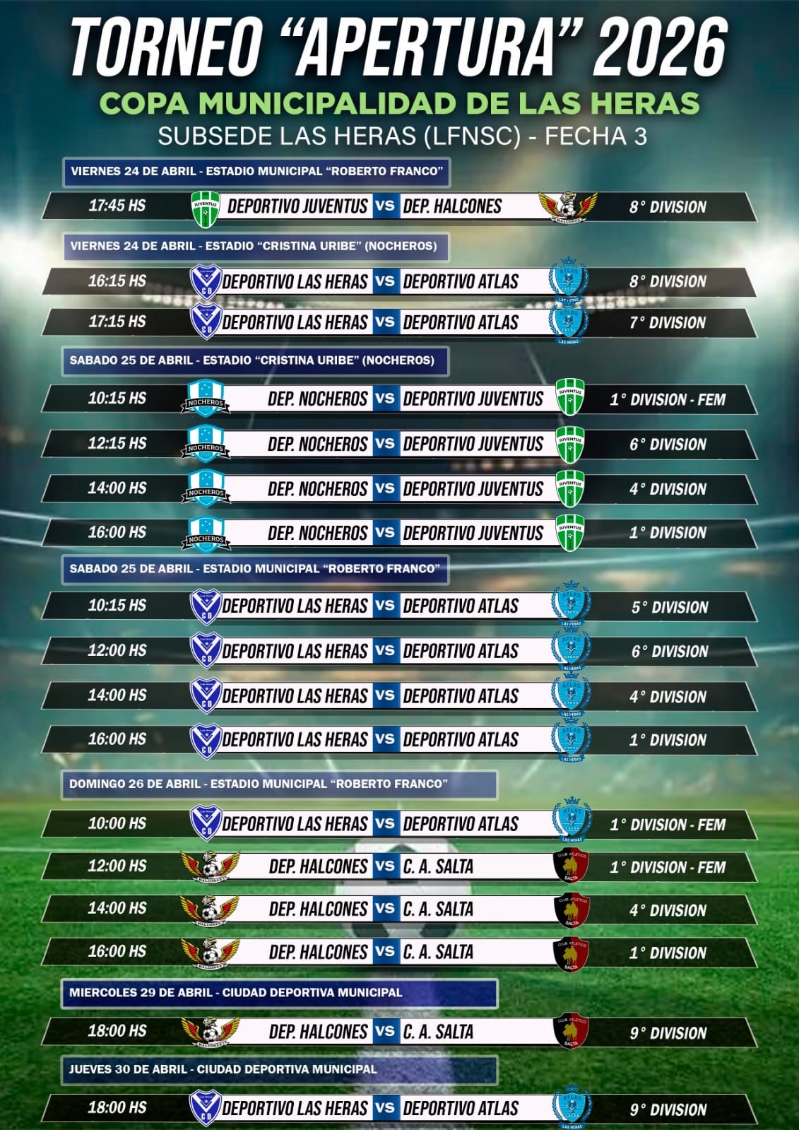 La COPA “MUNICIPALIDAD DE LAS HERAS” que organiza la Subsede Las Heras de la Liga de Fútbol Norte de Santa Cruz tuvo actividad durante viernes, sábado y domingo en el marco de la 2da. fecha del primer Torneo del año.