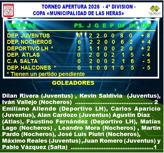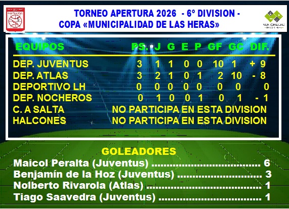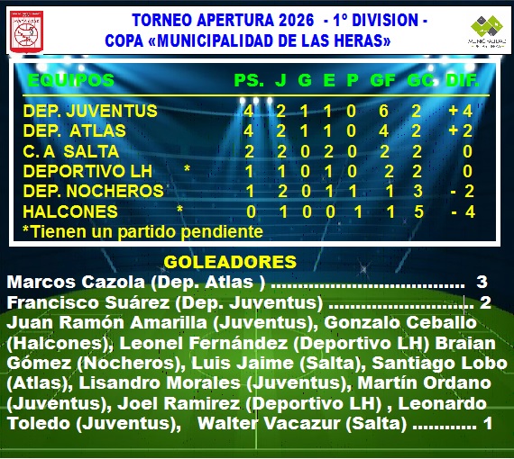 *Por la 2da. fecha del Torneo “Apertura” 2026 se registraron sendos empates en los dos partidos de 1era. división que se jugaron el fin de semana . Nocheros igualó sin abrir el marcador ante Salta y en el choque de punteros Atlas y Juventus finalizaron 1 a 1 . No se jugó por la lluvia el partido entre Deportivo Las Heras y Halcones *