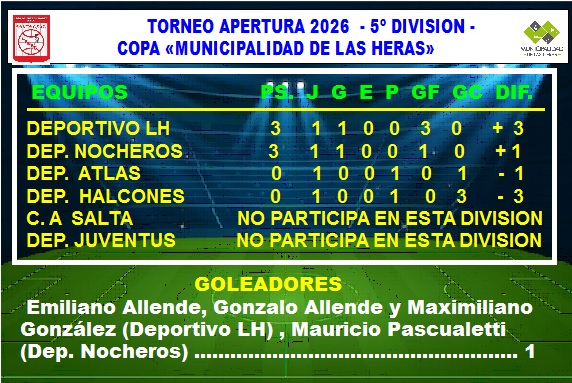 El dìa sábado se jugó la doble jornada y en el Estadio Municipal “Roberto Franco” el Club Deportivo Las Heras venció 3 a 0 a Halcones en 7ma. División y por el mismo marcador en 5ta. división .