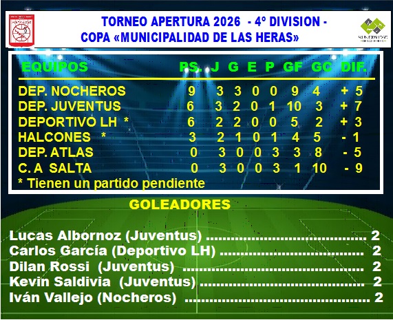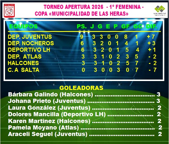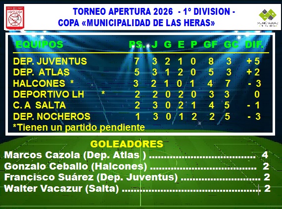 *Con la victoria ante el último campeón Nocheros , el Club Deportivo Juventus quedó solitariamente en la cima del certamen en 1era. división. El ahora escolta Atlas igualó 1 a 1 con el Club Deportivo Las Heras y Halcones obtuvo sus primeros tres  puntos al ganarle 3 a 2  al Club Atlético Salta.  Para este viernes se programó el partido pendiente entre Halcones y Deportivo Las Heras y durante sábado y domingo se juega íntegramente la 4ta. fecha. *