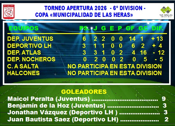 DEPORTIVO LAS HERAS …..6 (Jonathan Vázquez -3-, Juan Bautista Saez -2-, Ian Pedrozo)