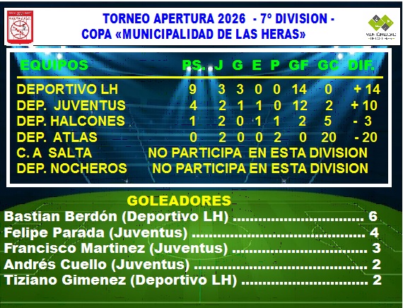 DEPORTIVO LAS HERAS ….7 (Dilan Gamarra -3-, Bautista Altieri -2-, Diego Valencia, Matías Ríos)