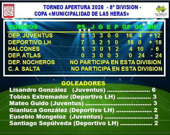 En la jornada del viernes en 8va.  división Juventus le ganó 5 a 2 a Halcones en el partido pendiente de la fecha inicial y en la misma división el Club Deportivo Las Heras goleó 9 a 0 al Club Atlas.