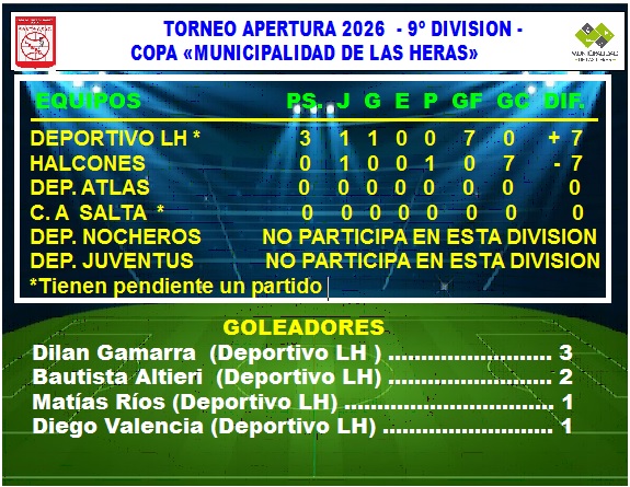 El miércoles pasado se jugó el partido inicial de la división menor del torneo (9º División , categorías 2017/2018) con la victoria del Club Deportivo Las Heras por 7 a 0 ante Halcones, en partido disputado en la Ciudad Deportiva Municipal.